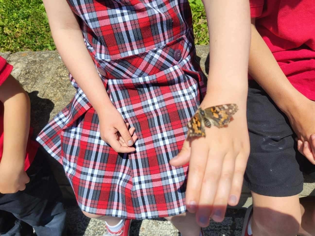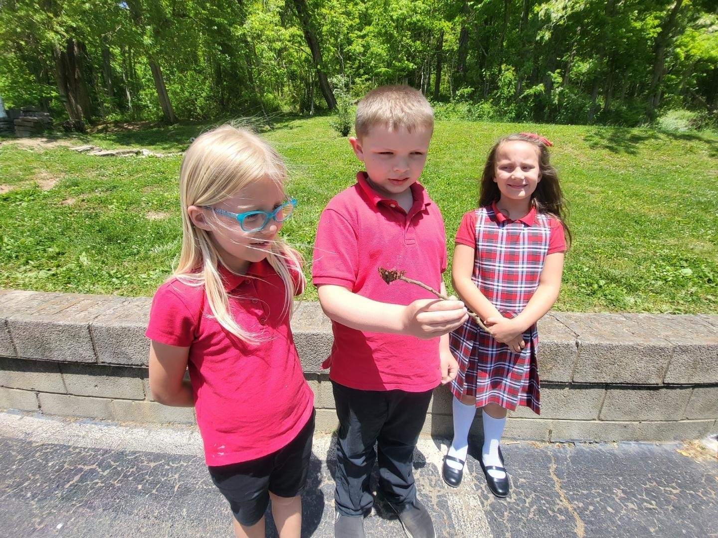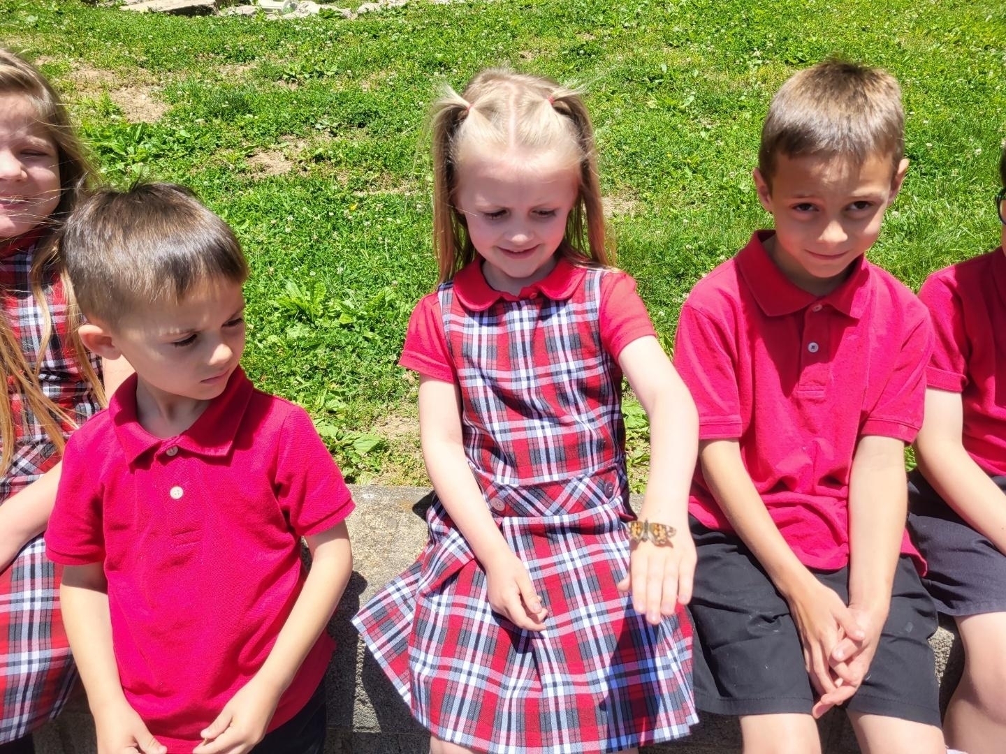 Several classes were given a cup with caterpillars in it. The students learned about the life cycle of a butterfly as they watched the caterpillars grow from a quarter of an inch to about 1 1/2 inches in length, form a chrysalis around themselves, and finally break out into beautiful Painted Lady butterflies. Today the kindergartners released their butterflies into God's wonderful world. They were sad to see them go, but also had fun watching them fly off to enjoy their freedom.