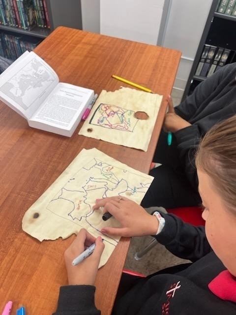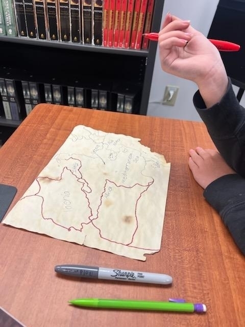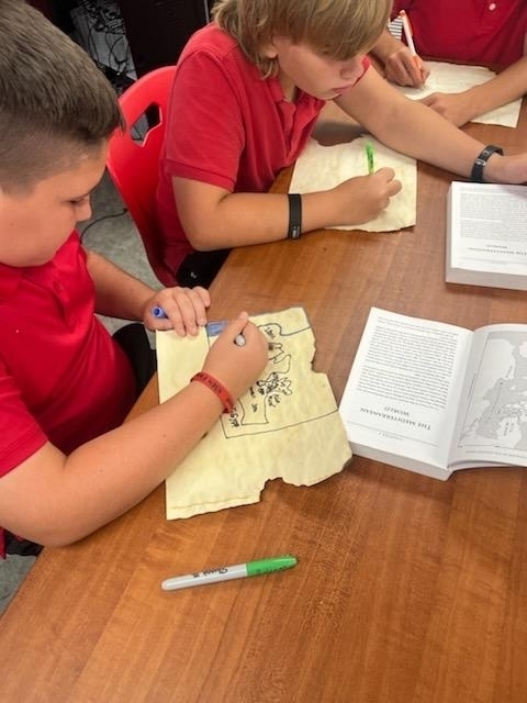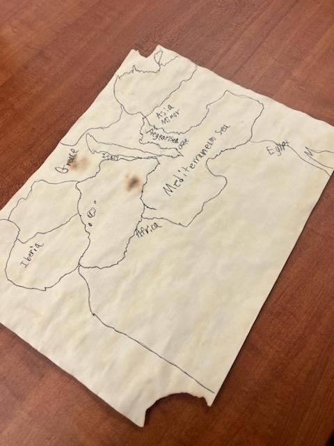 Now, it wouldn’t be all that fun to work with regular printer paper or construction paper; we had to up the ante a bit. As seen in the photograph, students had the chance to work with some faux vintage map-making materials crafted through coffee staining, baking, and singeing. We look forward to doing more hands-on learning projects with the Fifth and Sixth-grade class as we continue our study of geography and world civilizations.