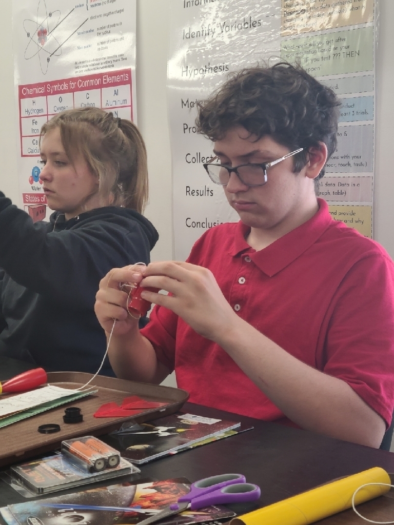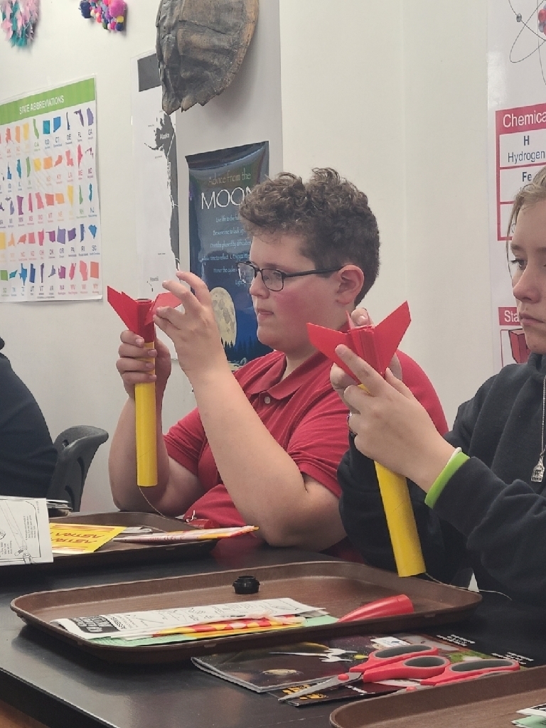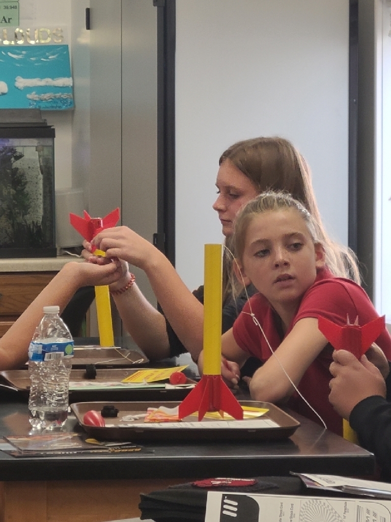 A 4 day STEM Rocketry Program is underway at SMS. Mr. Tom Zachman is the lead instructor and has provided all 7/8 th grade students with a Quest Astra III model rocket they built together in class. On day 1, Mr. Zachman introduced the students to the history of rocketry and aerospace science. Students also learned about the physics of rocketry as it applies to sport/model rockets and how NASA and SpaceX launch rockets are extremely similar. Day 2 covered Newton’s 3 laws of motion, balanced and unbalanced forces and calculating force and magnitude of change in motion.