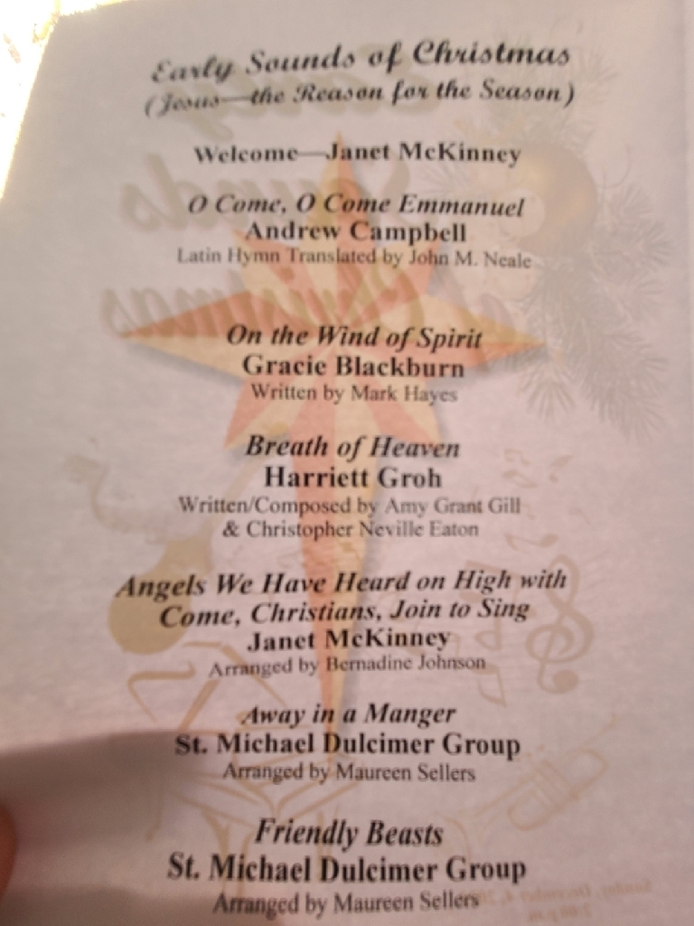 Several SMS students, staff members, and alumni performed today at the "Early Sounds of Christmas" concert today at the Ripley Church of Christ. Several familiar Christmas songs were played by the SMS Dulcimer Group led by Mrs. K. Congratulations on a job well done by Brayden Heslar, Laynee Hamilton, Gideon MacRae, Isaac Boldman, Joseph Gast, and Miah Santoro. Special thanks to Mrs. Chamblin for helping as well. Also performing today was SMS alumni Gracie Blackburn and SMS staff member Mrs. Groh. Great job everyone!